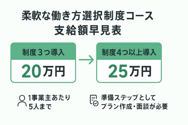 柔軟な働き方選択制度を導入し、対象労働者が利用した場合、支給額は導入した制度の数に応じて変動します。