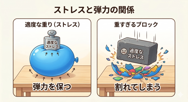 ストレスと心の関係はよく「風船」に例えられ、外部からの圧力(ストレッサー)が強すぎると、心という風船は元に戻らなくなってしまいます。